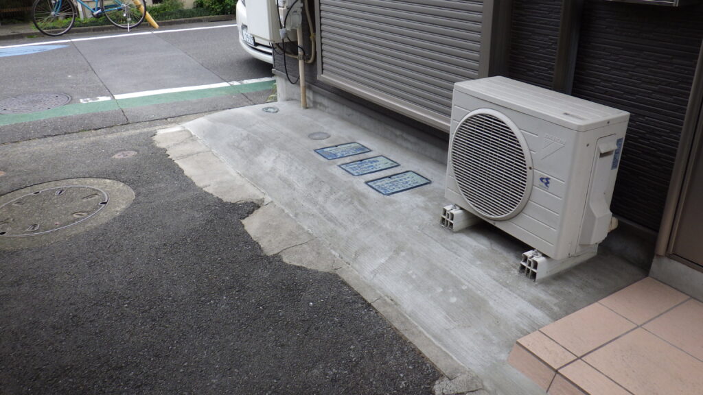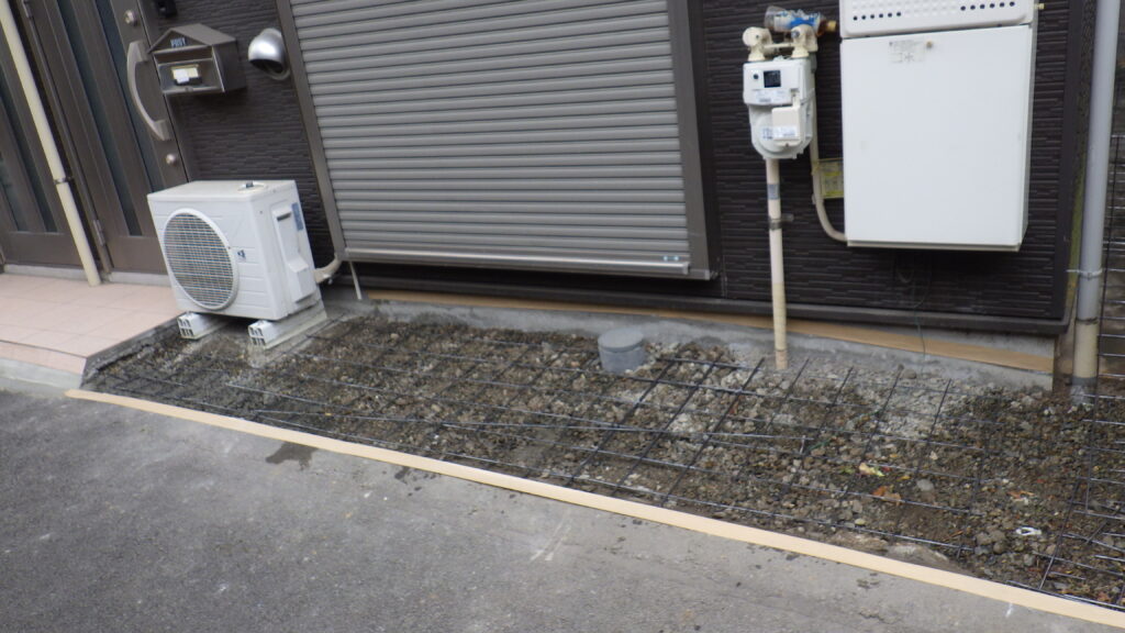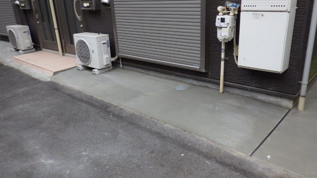 今回の工事では、既存土間を撤去・下地調整のうえ、玄関前私道との段差や既存の傾斜状況を丁寧に確認。雨水の滞留を防ぐため、適切な勾配を確保し、水捌けを考慮した土間コンクリート施工を行いました。
