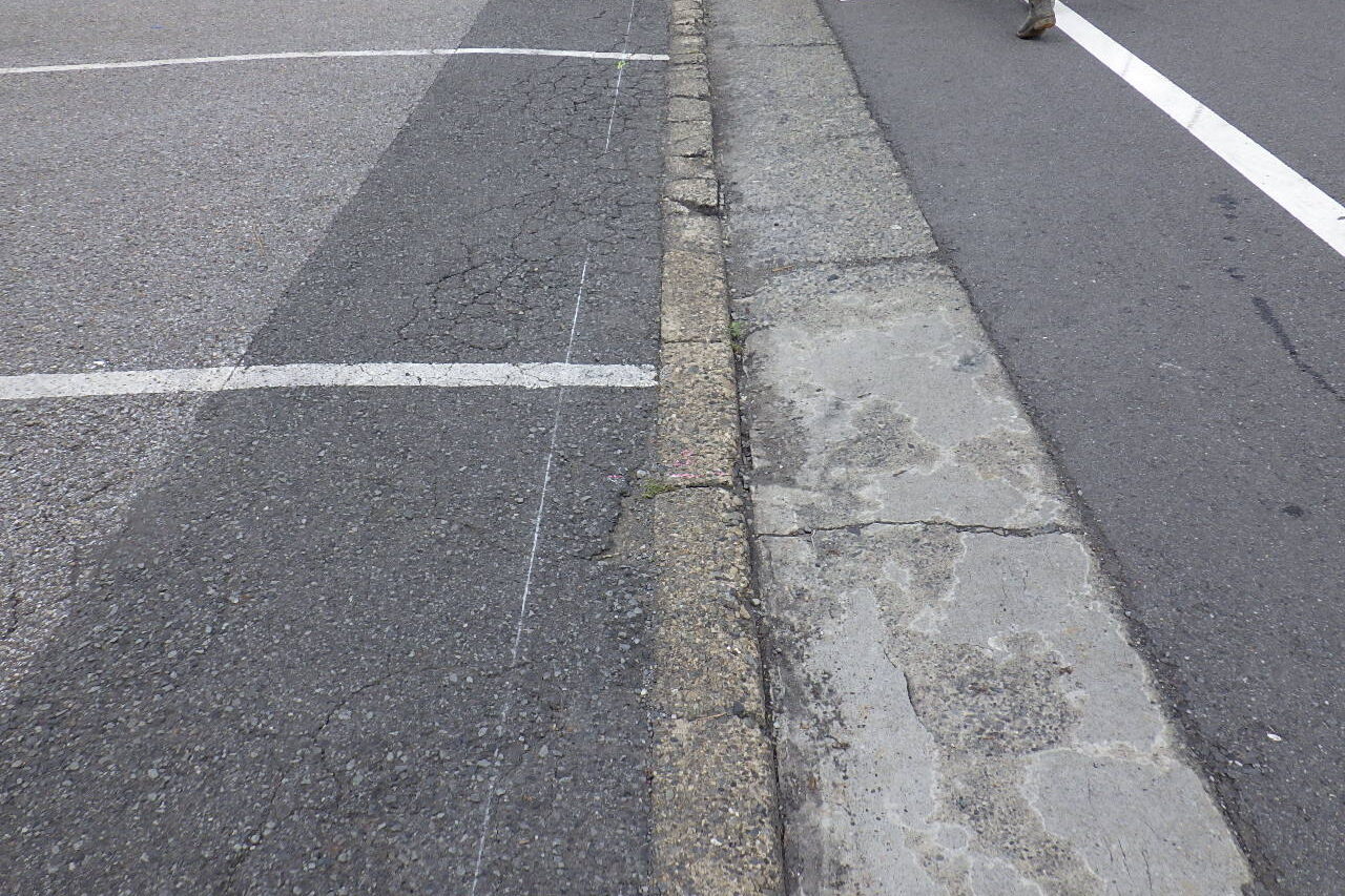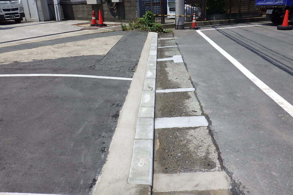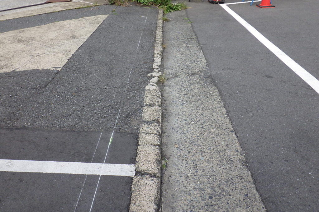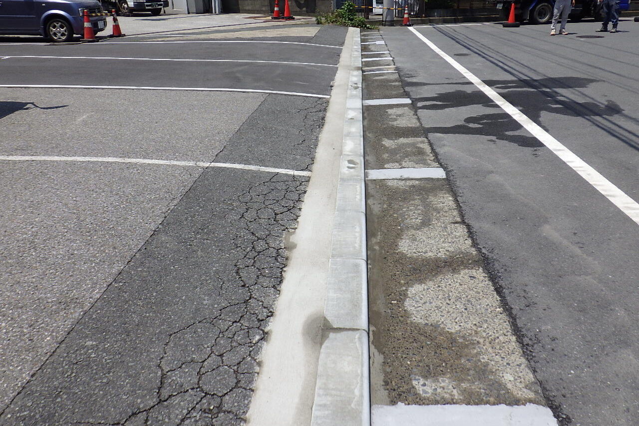 特に大型ダンプ等の通行荷重の影響により、縁石部分にひび割れや段差が生じている状態でした。