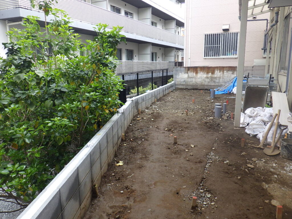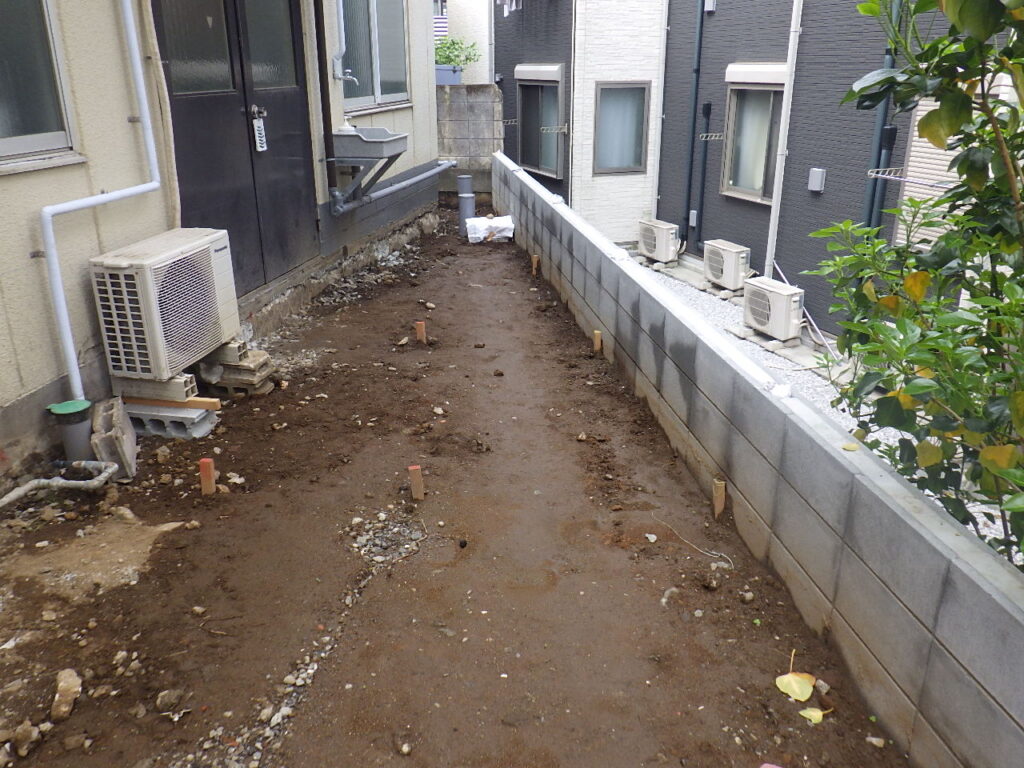 既存の状態では雨水の流れが悪く、大雨の際に水たまりができやすい状況だったため、排水機能をしっかり確保することを目的とした工事でした。