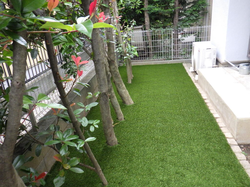 植栽の形状に合わせて人工芝を一つひとつ丁寧に加工し、隙間や浮きが出ないよう細かく調整しながら施工しました。