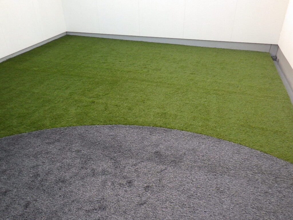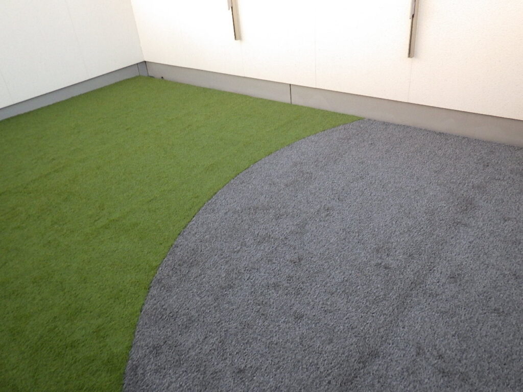 今回は、グリーンの人工芝とグレーの人工芝を組み合わせたデザイン施工を採用。お客様とご相談しながら配置を決め、やわらかい印象になる半月型のデザインで仕上げました。