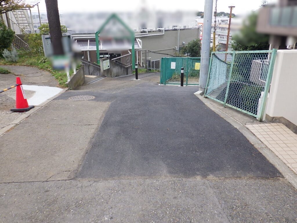 施設前の道路は公道ですが、道幅が非常に狭く、さらに勾配もあるため、車両の出入りがしづらい状況でした。